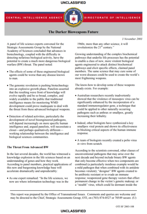 "CIA Unclassified - The Darker Bioweapons Future"