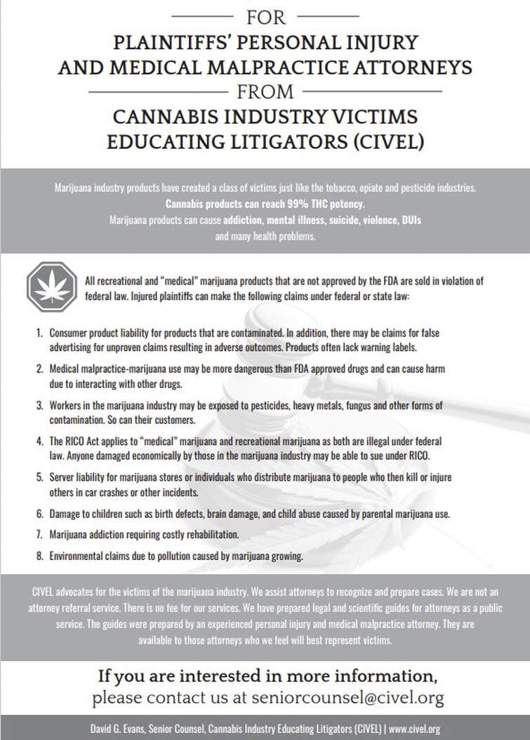 David G. Evans, Esq., is Senior Counsel for the Cannabis Industry Victims Educating Litigators (CIVEL) who educate lawyers on how to make the marijuana industry accountable to their many victims. Mr. Evans was a plaintiff's litigator in personal injury and employment law cases. Attorneys who desire more information can contact Mr. Evans at seniorcounsel@civel.org . The CIVEL website is: www.civel.org
